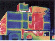 图4:红外检测清楚的显示楼房能量损失程度。楼龄为8年,红外图象显示在墙体和房顶都有明显的热损失,基础处也没有隔热处理。对楼顶进行检测发现天花板没有安装隔热材料。房屋主人知道了热损失程度,也确切理解了该采取措施进行改进。修补后可再用红外检测评估隔热安装的效果和质量。