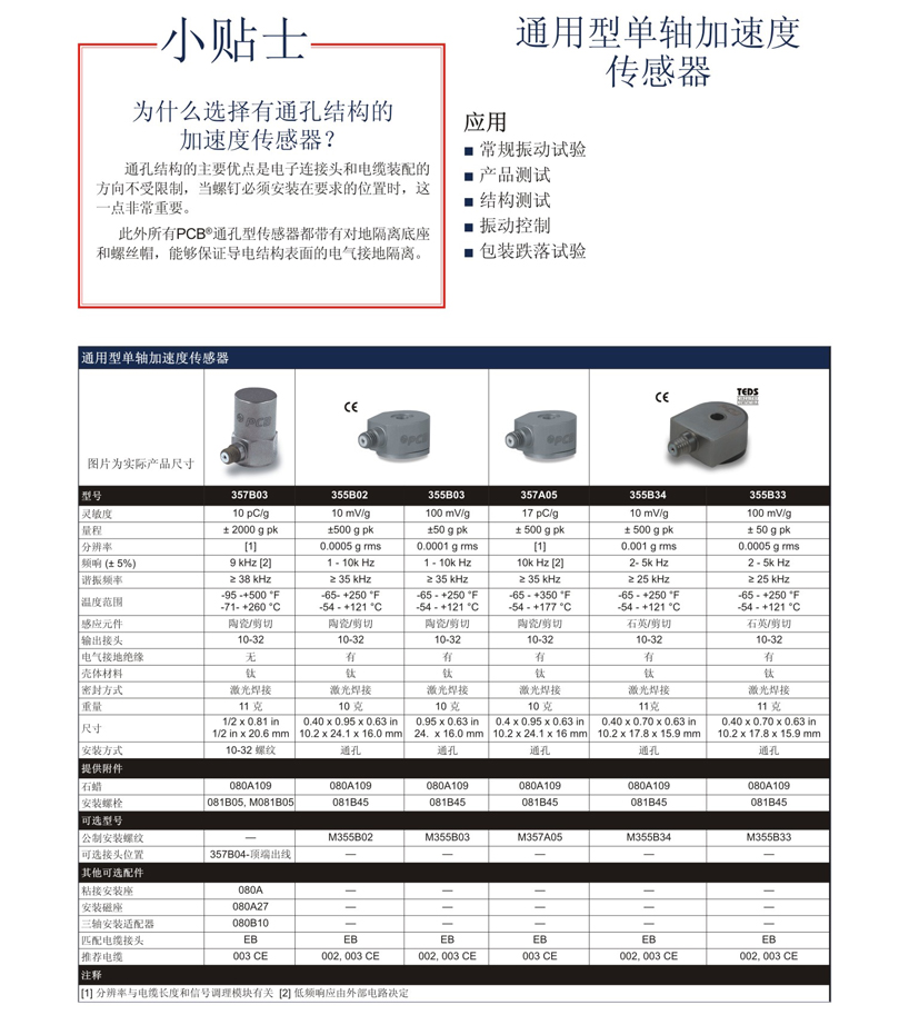 美国PCB加速度传感器 355B33单轴 加速度传感器 加速度计 产地:美国