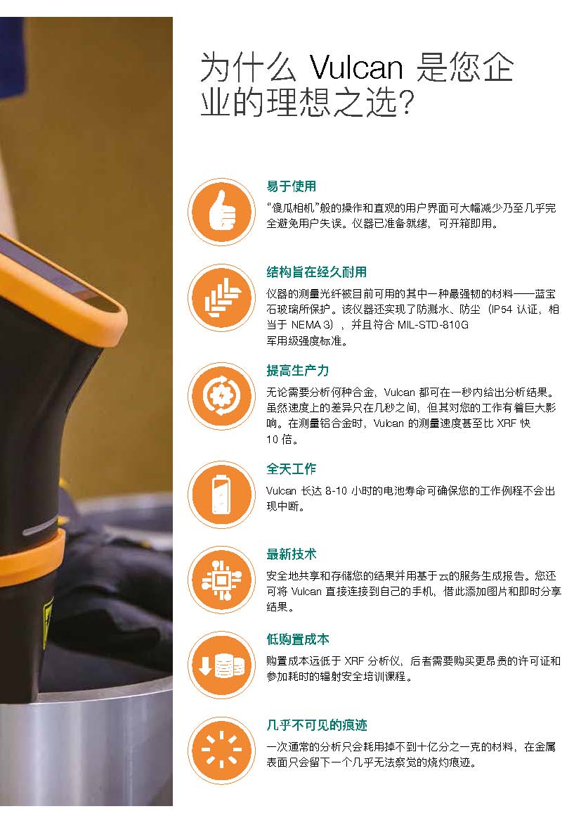 Vulcan 是一款耐用且分析速度极快的合金分析仪??郯饣笠幻爰椿嵯允窘峁?。且产品使用激光诱导击穿光谱技术 (LIBS),您无需担心X射线的影响。无论您的业务是废料分选还是 PMI 质量控制,Vulcan 始终提供准确且一致的合金 牌号。