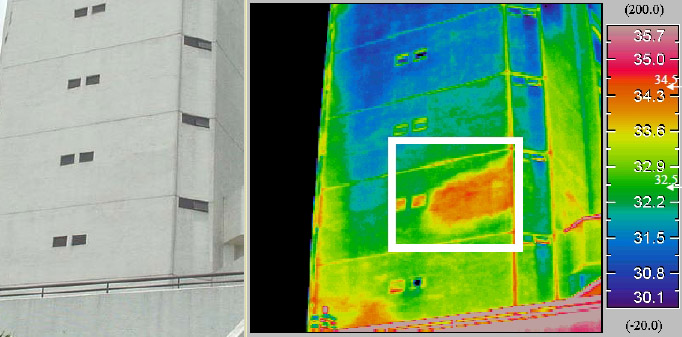 建(构)筑物墙面、屋面及各种管道在使用过程中因各种因素导致的开裂、断裂而造成渗漏等缺陷均可用红外热像仪进行检测,而且方便、快速、可大面积检测,而有时人工目测却找不出问题所在。如果建筑物表面深层相对于周围的材料表现出热或凉,则其表面的温度也相应地表现出热或凉,借助红外热像仪可探测出这一深层热或凉的位置。如地下管道隔热层断裂,那么,在表面将会产生热点,用热像仪可直接测得;管道热水泄漏浸透周围区域,使区域导热性增加,从而使周围温度比无泄漏干燥区温度高,据此可探测泄漏部位,可以避免不必要的开挖过程,节省费用。
