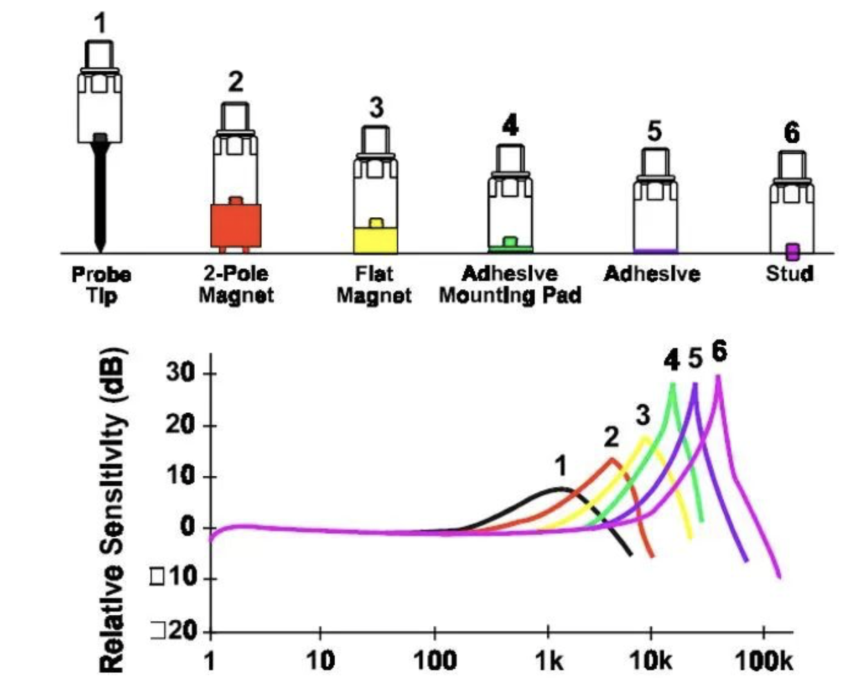 不同的安装方式会显著的影响传感器的谐振频率,也就是传感器的高频响应。下图有说明安装方式对谐振频率的影响。优先选择螺钉安装,其次是热熔胶或瞬干胶,然后双面胶等等。